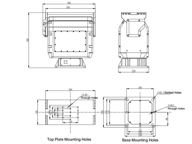 | Lower Output Cable | One high-flex integrated cable (4 cores); one DC24V input power cable (system power supply); one RS422 (pan tilt control) | With camera / laser / speaker / high-power fill light / USB3.0 / infrared thermal imaging / radar (0–36/36–18G) / 4G |